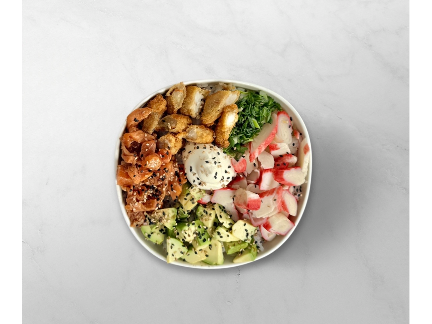 Colchón de arroz, salmón trout ahumado, kanikama, langostinos apanados, queso philadelphia, palta, cebolla de verdeo y semillas de sésamo. Incluye una salsa a eleccion y cubiertos.