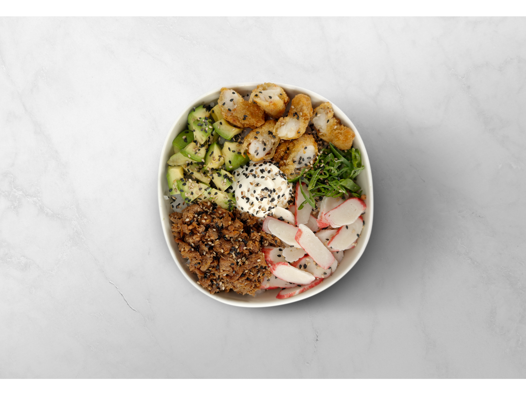 Colchón de arroz, salmón trout cocido en salsa teriyaki, kanikama, langostinos apanados , queso philadelphia, palta, cebolla de verdeo y semillas de sésamo. Con reducción teriyaki